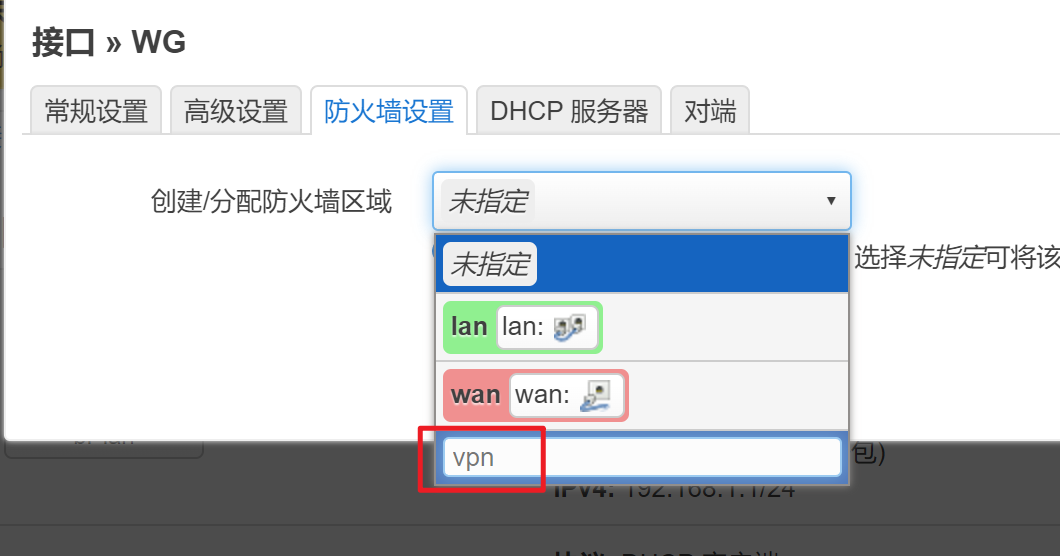 进入 网络 – 防火墙 – 常规设置 – 区域 中,编辑 lan 区域,将允许转发到目标区域勾选上 vpn 区域,将允许来自源区域的转发也勾选上 vpn 区域,保存;将 vpn 区域的转发改为接受,保存并应用设置。
